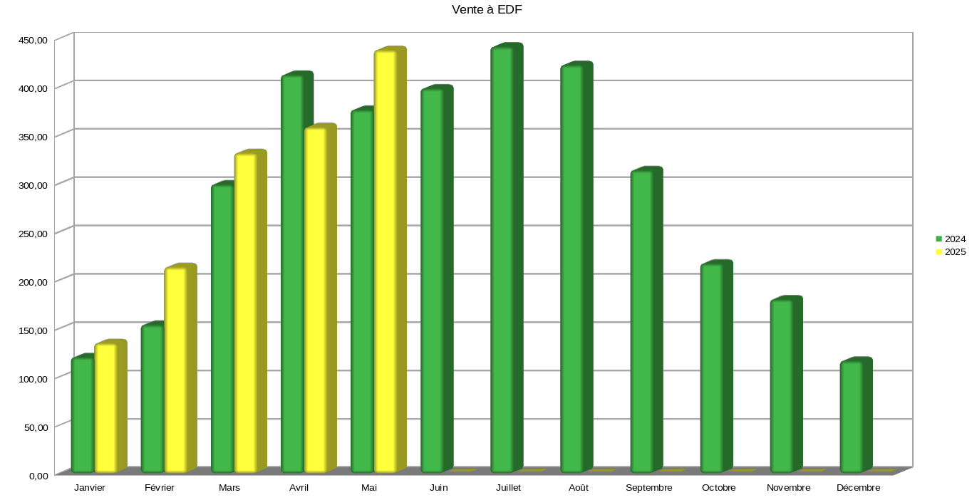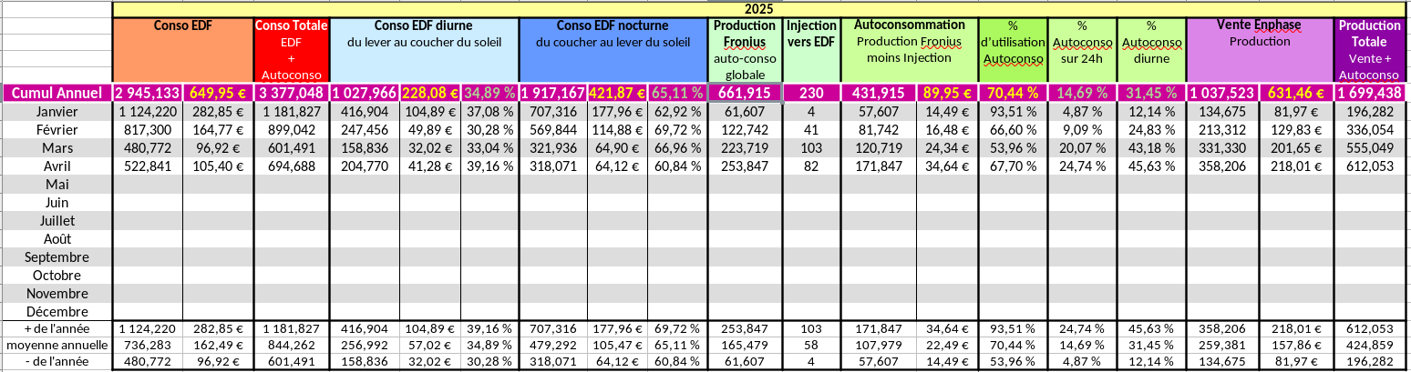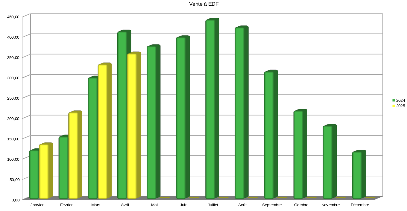Consommation EDF similaire à celle de 2024, baisse de la production photovoltaïque par rapport à Avril 2024 car il y a eu moins d'ensoleillement.
