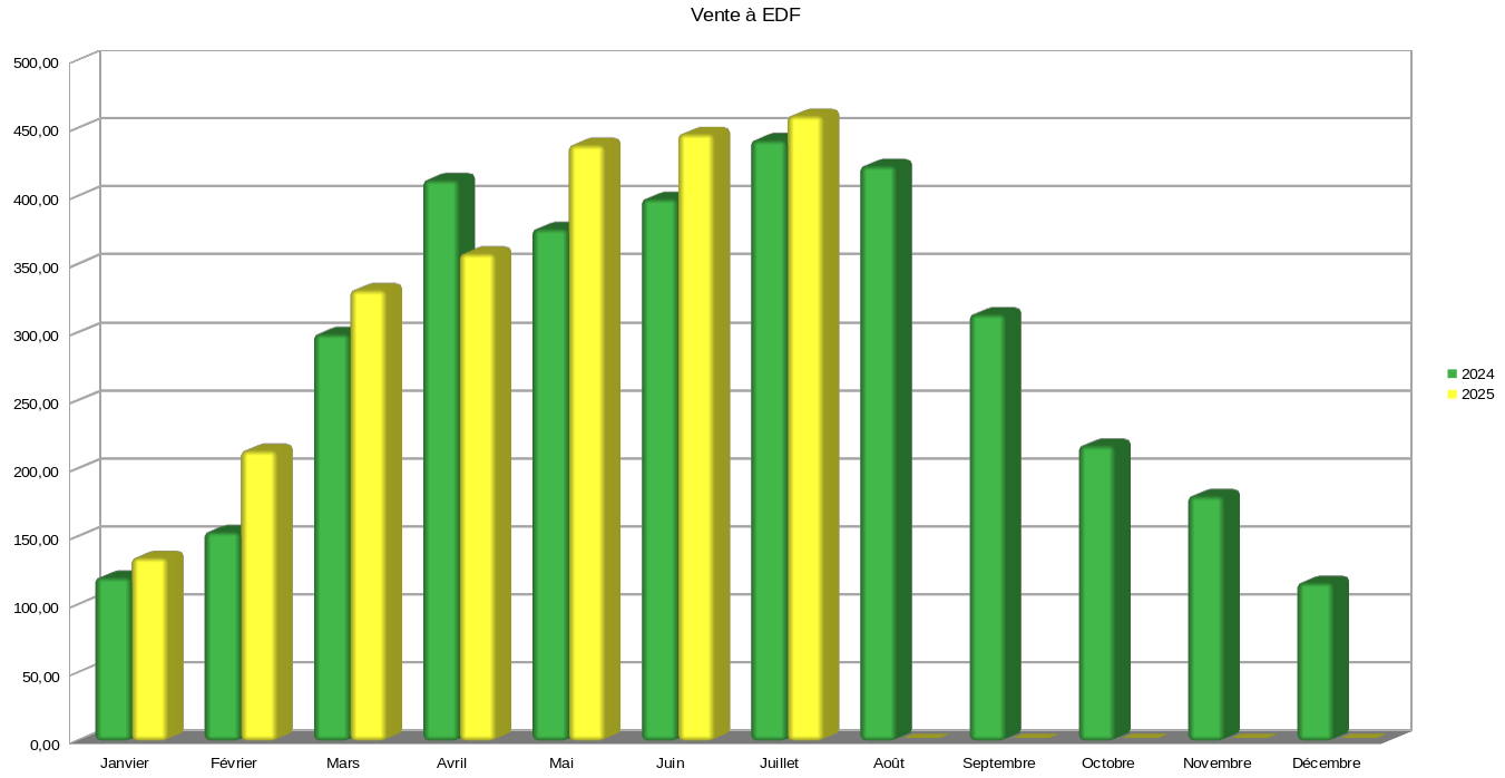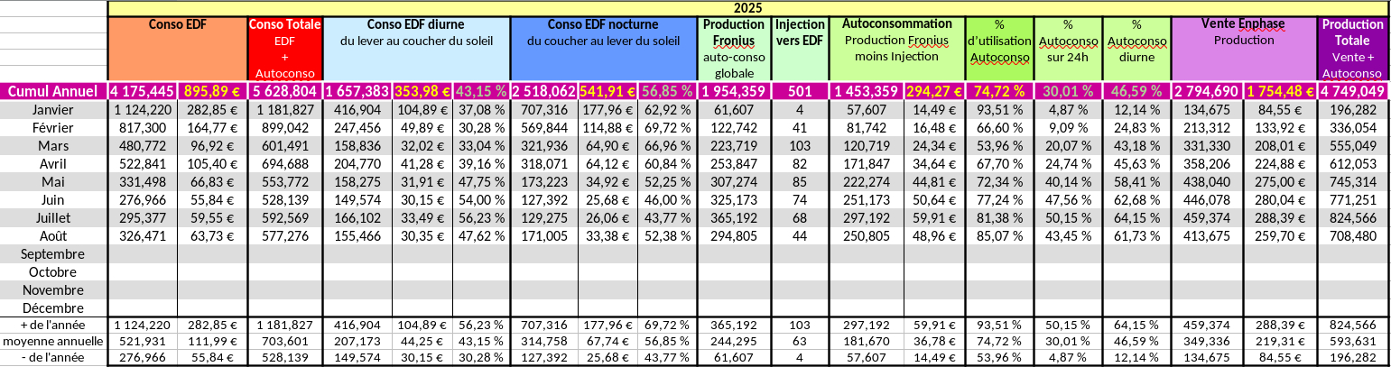 Légère baisse de la consommation EDF, par rapport à 2024, comme en Juin/Juillet, baisse aussi de la vente (à cause des matinées nuageuses) et une petite hausse des productions pour l'auto-consommation (grâce à l'ensoleillement de l'après-midi) .