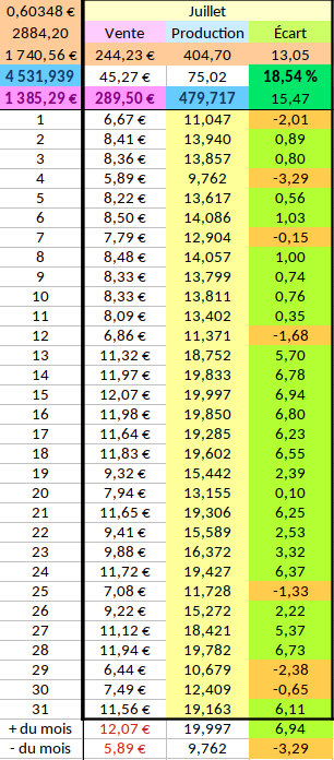 Remarque : Depuis l'installation des nouveaux panneaux, j'ai modifié à plusieurs reprises les profils de production (zéro export, limite à 3 kWc, no limit, ...) pour tester les différentes possibilités et j'ai aussi mis en place un mécanisme d’inversion des systèmes de production depuis le 13 juillet. La cohérence des résultats est donc à lire en fonction de la connaissance de ces événements.
