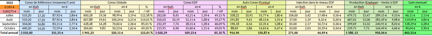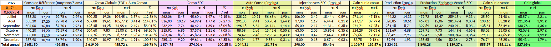 - Gain quotidien moyen lié à l'auto-consommation (en vert sur fond jaune)