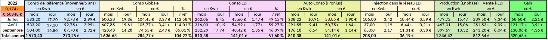 - Gain quotidien moyen lié à l'auto-consommation (en vert sur fond jaune)