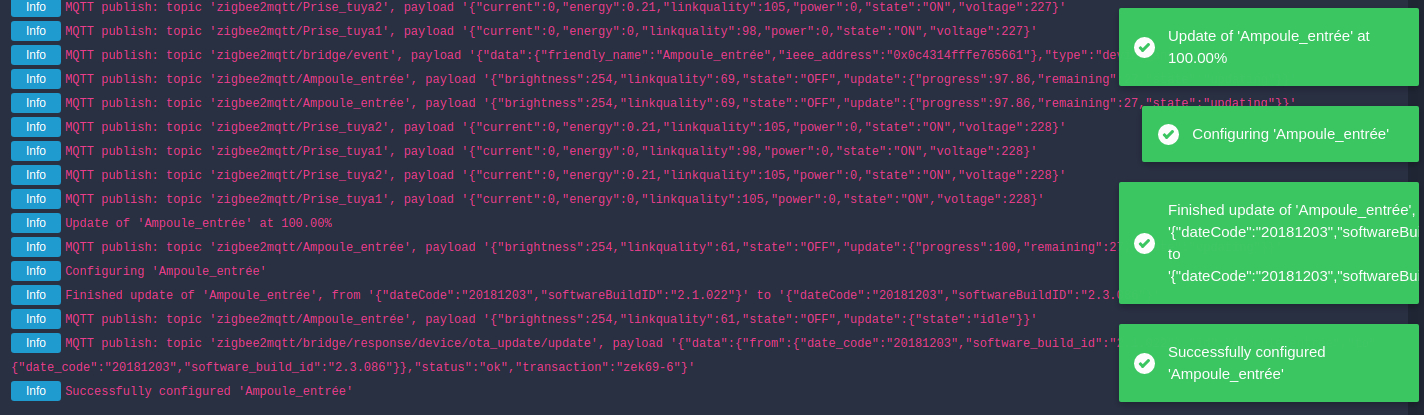Après avoir mis à jour la version de Zigbee2mqtt et changé la version du firmware du dongle, j'ai testé la mise à du firmware sur une ampoule Ikea et ça fonctionne