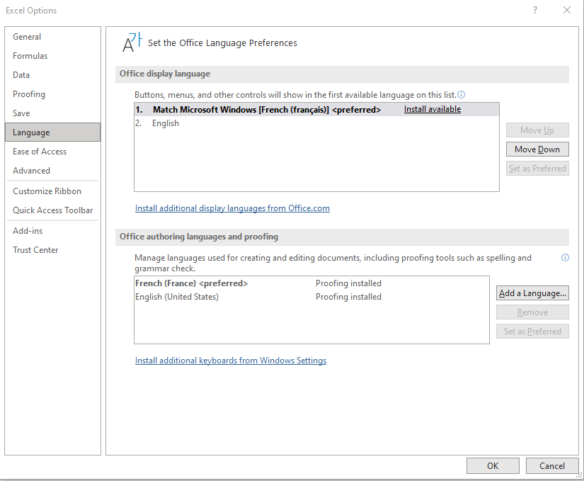 Comme j'ai suivi exactement la méthode proposée, à la fin les logiciels sont en anglais. Mais il suffit d'aller dans les options (d'Excel par exemple) et de choisir "Install available" pour passer en Français.