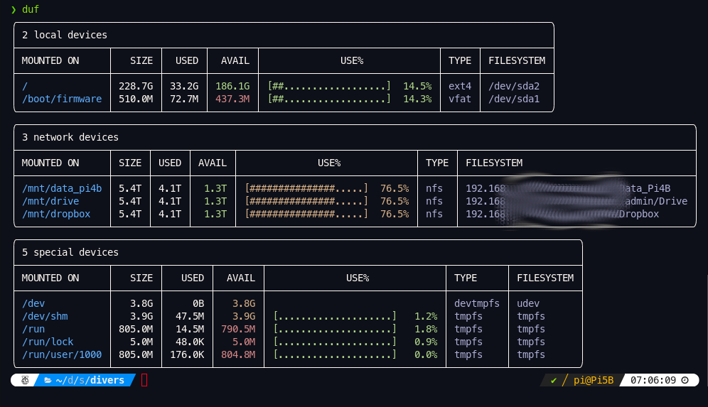 La première est duf qui permet une visualisation de l'espace disque et des points de montage.