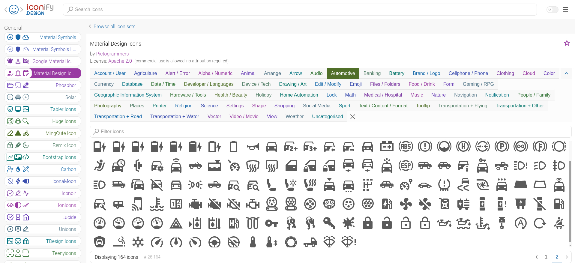 Le choix global parmi 200 000 icônes classées par thème et par type. En haut, il y a aussi une recherche par nom.